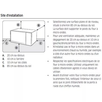 Les points clés réchauffer et décongeler L x H x P : 48.5 x 29.2 x 41.7 cm - Diamètre du plateau : 25,5 cm en verre boutons - Menus préprogrammés du micro ondes : 10...Prix normal €233,99Prix normal €233,99 -