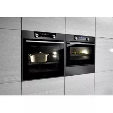 La porte froide 4 vitres avec réflecteur de chaleur assure une sécurité optimale, tandis que le design Craft Black Steel en inox noir brossé confère à ce four une allure moderne et élégante, s'intégrant parfaitement dans les cuisines contemporaines.