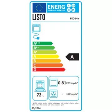 Le four encastrable LISTO FEC L4n, avec sa classe énergétique A, garantit une consommation maîtrisée de 0.81 kWh en convection naturelle, alliant ainsi respect de l'environnement et économie d'énergie.