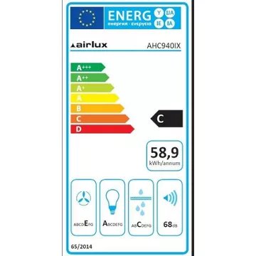L'AIRLUX AHC940IX offre un confort d'utilisation avec ses commandes par boutons poussoirs et ses 3 vitesses d'aspiration, permettant de s'adapter à tous les types de cuisson. Les spots LED de 2 x 4 W offrent une excellente visibilité sur le plan de travail, tout en se classant dans la catégorie A pour l'efficacité lumineuse avec 68,68 lux/W. Les filtres à graisse métalliques, lavables au lave-vaisselle, et les filtres anti-odeurs à charbon actif fournis de série, assurent une filtration efficace et pratique. Avec une classe d'efficacité énergétique C, une consommation annuelle d'énergie de 58,9 kWh et un indice d'efficacité énergétique de 82,9, cette hotte combine économie d'énergie et efficacité, faisant d'elle un choix respectueux de l'environnement pour votre cuisine.