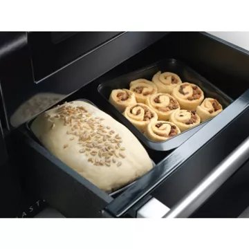 - Mode de cuisson : chaleur tournante brassée, le four est équipé de 2 résistances, une en bas (sole), une en haut (voûte) et d'une hélice placée au fond de la cavité qui permet de brasser l'air, pour une cuisson rapide et une repartition homogène de la chaleur.