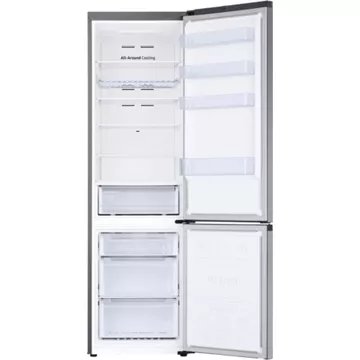 Le RB38C650ESA brille par sa technologie Froid Ventilé Intégral et Multi-Flow qui assure une répartition homogène du froid, évitant la formation de givre et garantissant une conservation optimale des aliments. La technologie SpaceMaxTM offre des parois plus fines pour une capacité nette de 386 litres, dont 272 litres pour le réfrigérateur et 114 litres pour le congélateur, sans compromettre l'encombrement extérieur. Les utilisateurs apprécieront les détails pratiques tels que les poignées intégrées, les portes réversibles, l'alarme sonore de porte ouverte et le distributeur d'eau. Avec ses 5 clayettes, 4 balconnets de contre-porte dont un XL, et ses 3 tiroirs de congélation, ce combiné Samsung allie esthétique MetalGrey et fonctionnalité pour répondre aux besoins des ménages modernes.