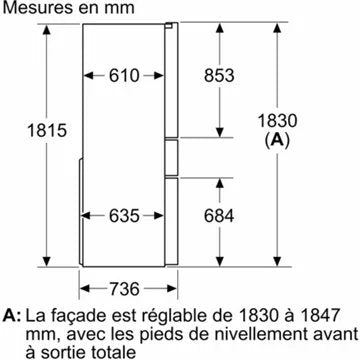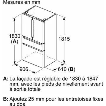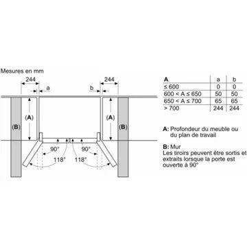 • Installation : porte avec débord, le réfrigérateur nécessite d'être installé à quelques centimètres du mur pour accéder facilement aux bacs et aux clayettes